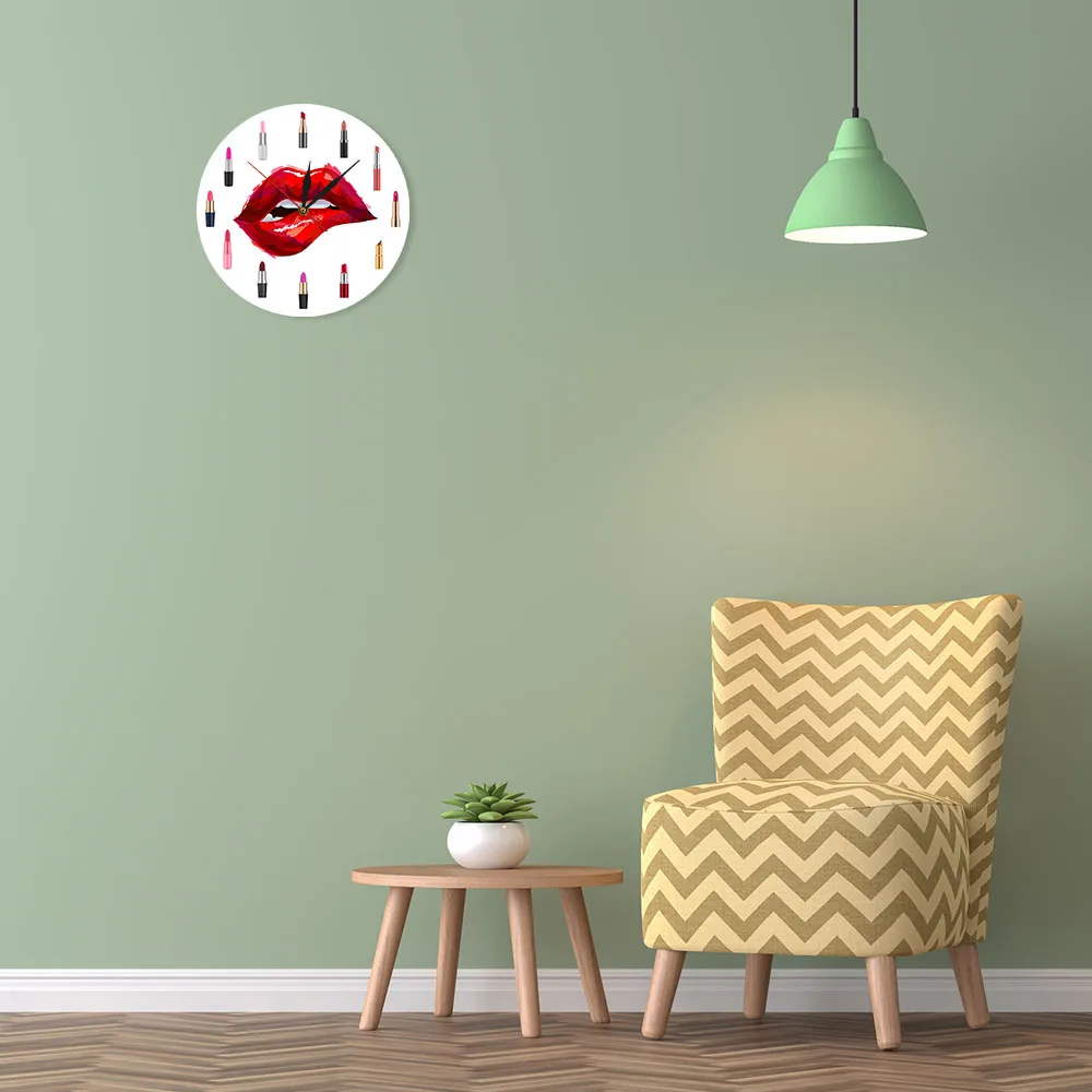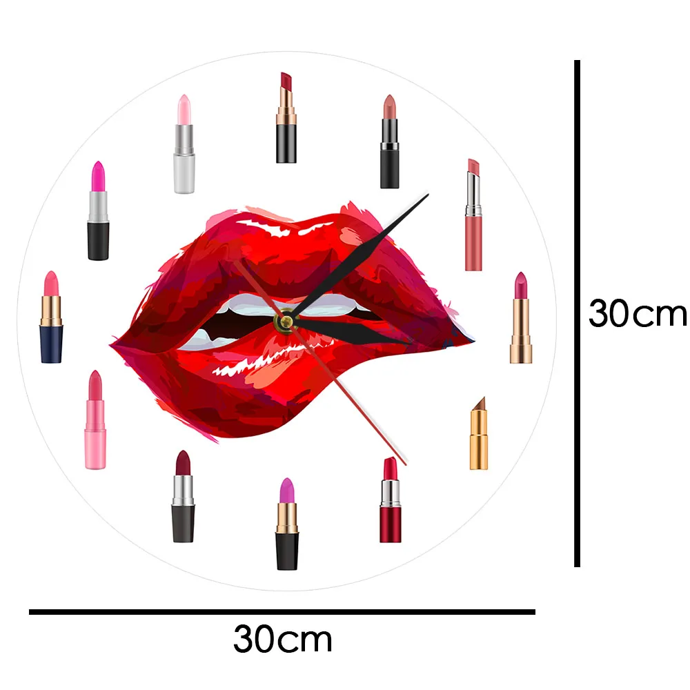 Red Lips Pretty Lipstick Printing Decorative Round Wall Clock Makeup Beauty Salon Bussiness Art Fas